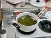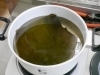 30分の講話の後はいよいよ本日のメイン「一番だし」「お味噌汁」づくりです。一番だしの材料は水3リットル、昆布20グラム、かつお節100グラム。昆布を水に30分漬けた鍋に火を入れます。こじんまりした家庭科室に私も合わせて大人が25人、火が付いたコンロが4台。だんだんと暑くなって参りました(-_-;)